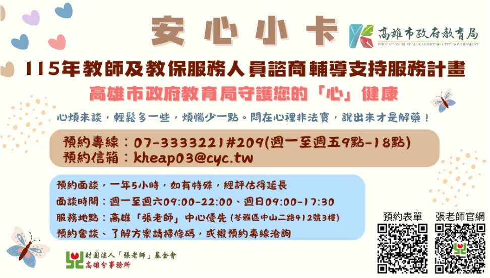 二、為促進與維護教師及教保服務人員心理健康,本局115年1至3月賡續規劃旨揭服務並委託財團法人「張老師」基金會高雄分事務所辦理,嗣後如更換或增加受託單位將另函轉知各校。