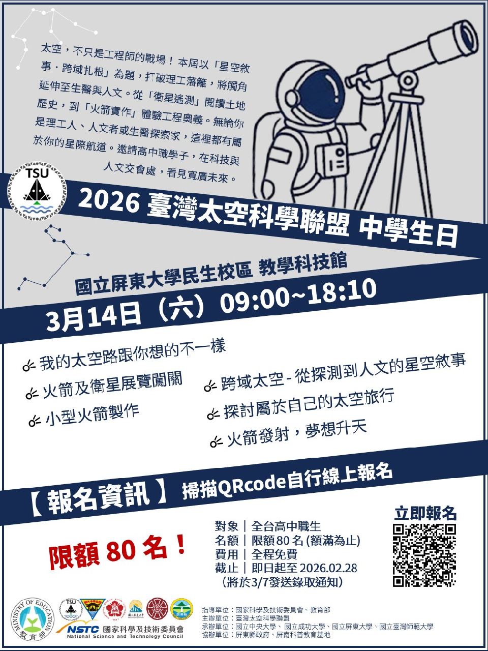 一、旨揭活動主題為「2026 臺灣太空科學聯盟 中學生日」,邀請各校教授、各企業人士來校分享;誠摯邀請貴校學生參與本次 TSU 學生日活動,期能促進不同年齡層與背景學生之間的交流與合作,並為對太空、航太及相關產業有興趣的學生提供更深入的認識與實際體驗機會。二、活動頁面: https://twspaceunion.org/tsu-hsd1/。三、即日起開放報名至額滿為止,將於 3 月 7 日發送錄取通知,報名網址:https://forms.gle/dciySAGwZKuouDMp6。